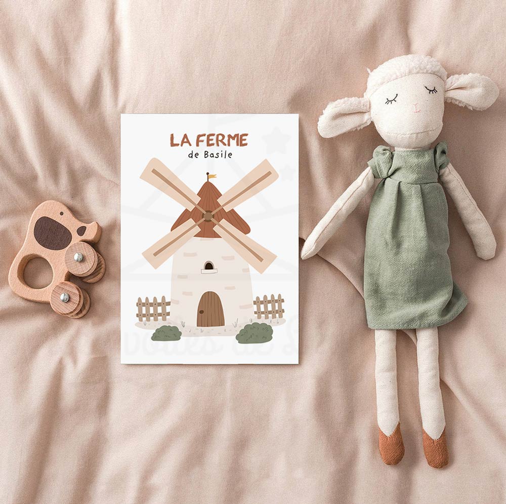 La personnalisation : une touche d’exclusivité – Bien que ce moulin soit magnifique seul, nous vous offrons la possibilité de le rendre unique en y intégrant le prénom de votre enfant. Cette option de personnalisation transforme l’illustration en un véritable objet de famille. La typographie, choisie pour sa douceur et sa lisibilité, vient se nicher délicatement au dessus du dessin, comme une signature. C’est le détail qui fait la différence lors d’un cadeau de naissance ou pour marquer le passage à une « chambre de grand » sur le thème de la ferme.