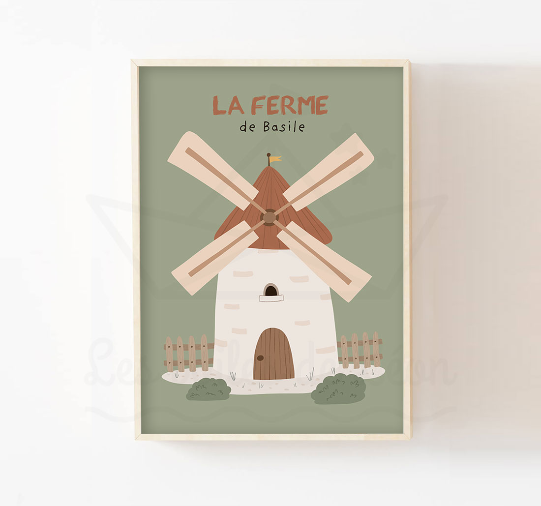 Parfaite pour accompagner votre décoration autour du thème de la ferme, cette affiche met en scène un moulin à vent traditionnel. Dessinée à la main, elle apporte une touche d’authenticité et de calme à la chambre, avec une personnalisation optionnelle du prénom.