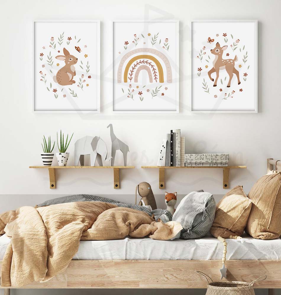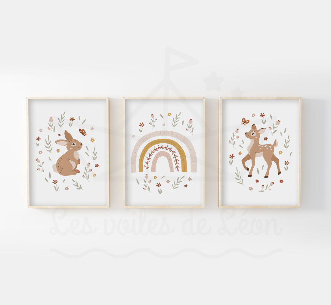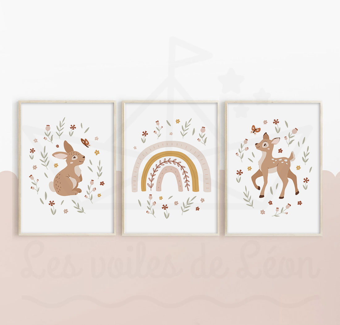 Affiches bohème chambre bébé rose et vert – Lapin arc-en-ciel Biche