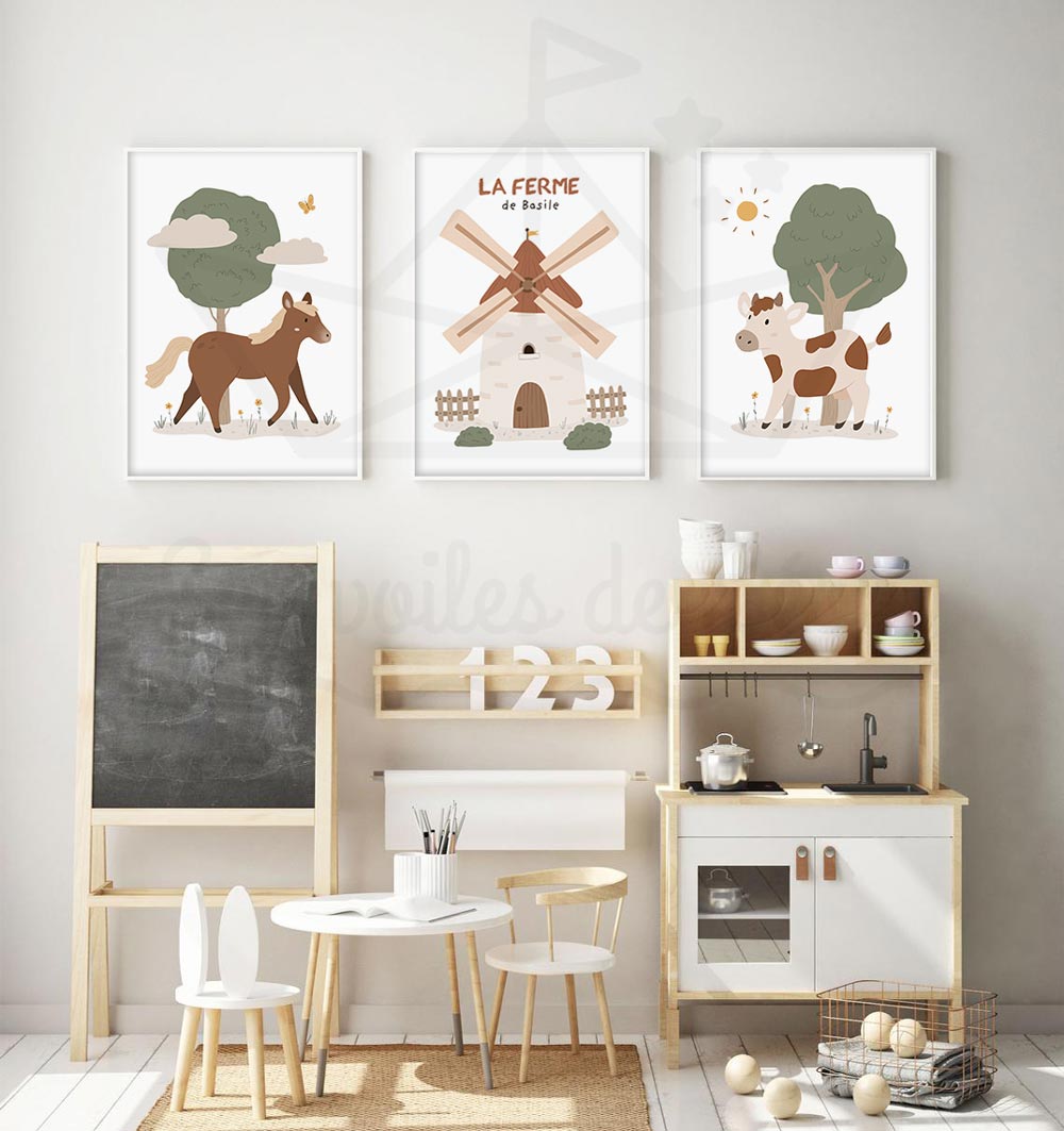 Décoration chambre enfant ferme – Lot de 3 posters avec prénom