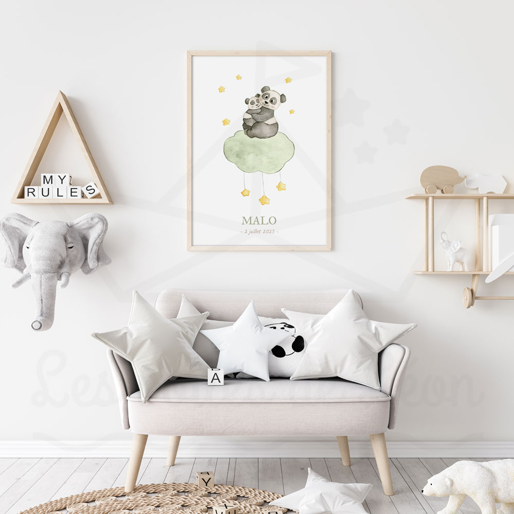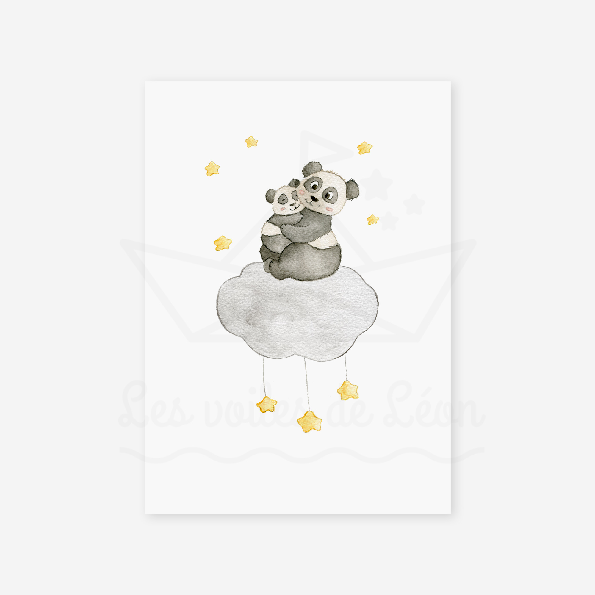 Poster bébé panda étoiles et sa maman à l’aquarelle
