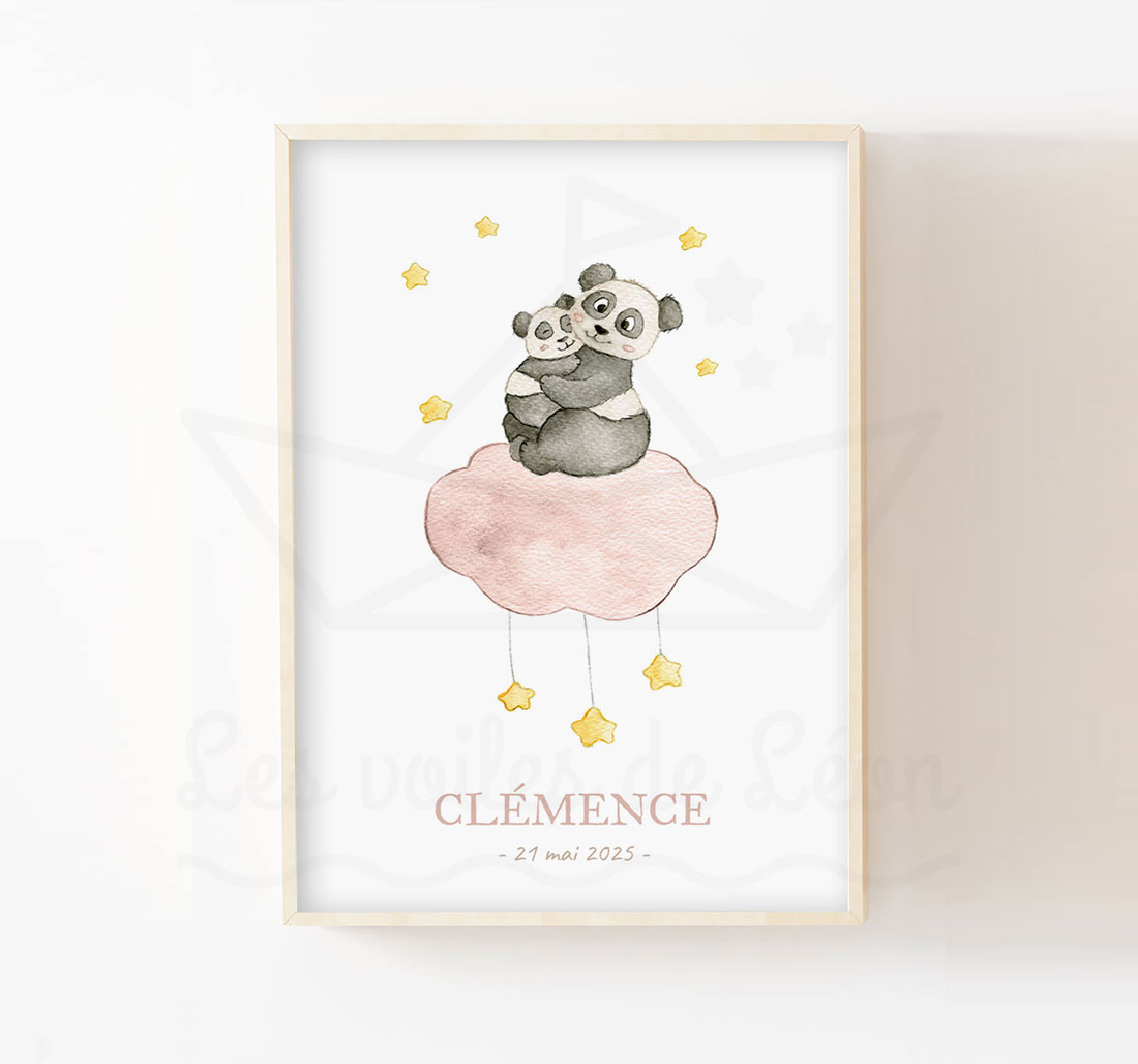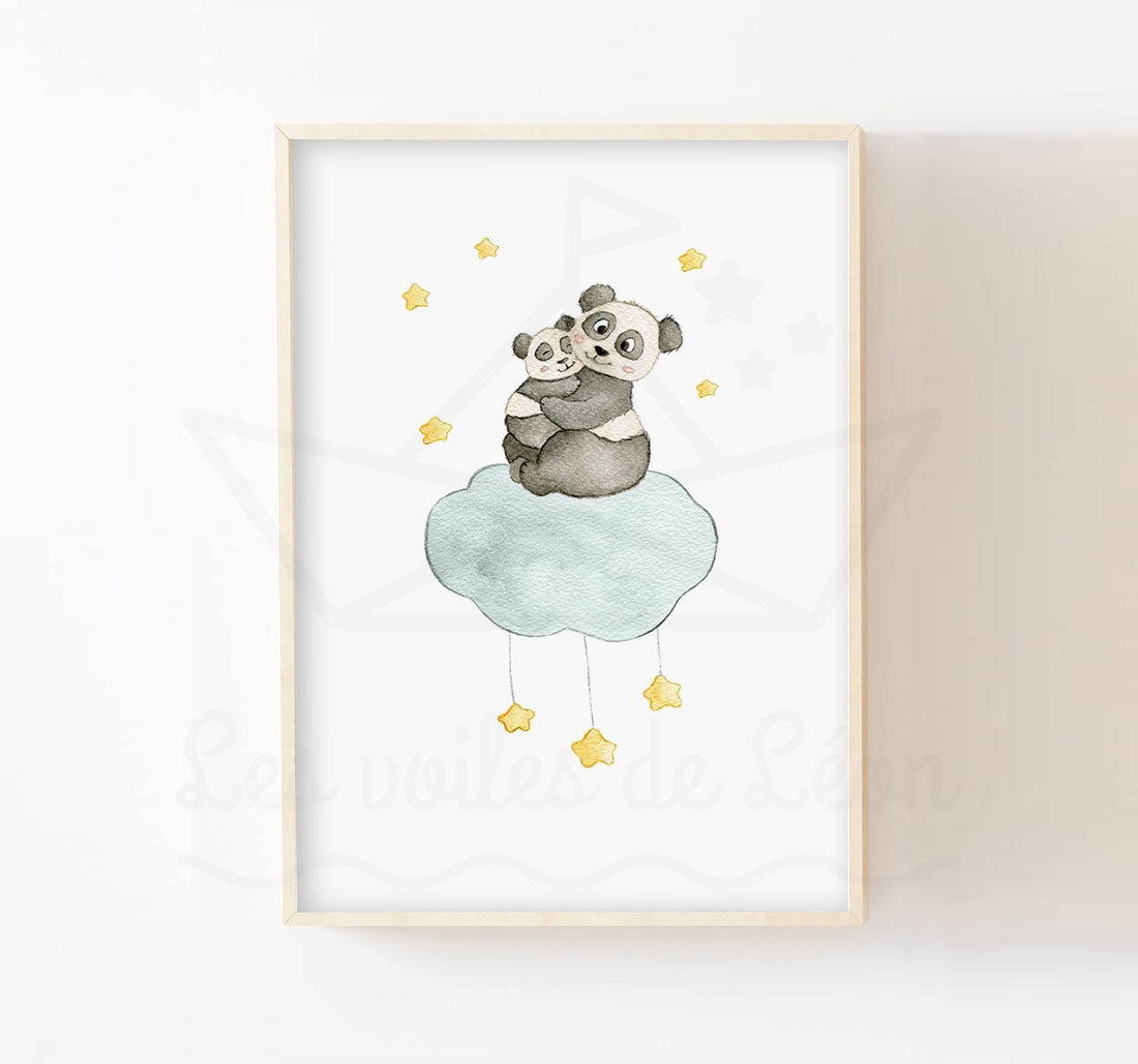 Panda maman et bébé sur un nuage – Aquarelle individuelle